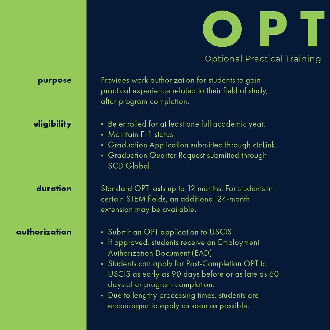 - OPT Sau khi hoàn thành khóa học: Bạn có thể nộp thực tập sau khi kết thúc chương trình học của mình. Thời gian làm việc tối thiểu là 20 giờ/tuần hoặc toàn thời gian.