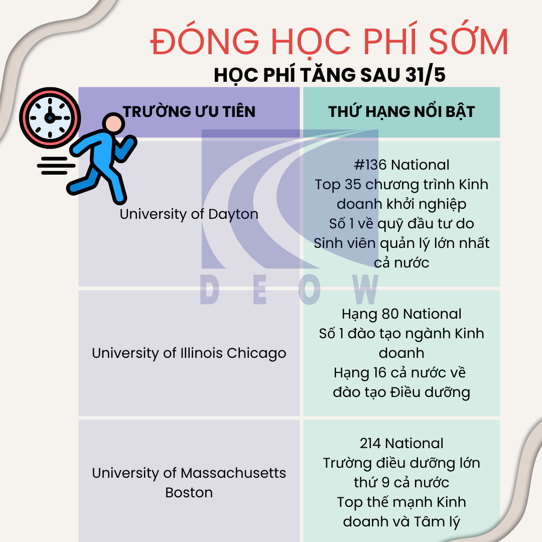• Tiết kiệm 3-5% học phí bằng cách thanh toán đầy đủ trước ngày 31 tháng 5 năm 2026 và tránh các đợt tăng học phí và lệ phí sắp tới.
