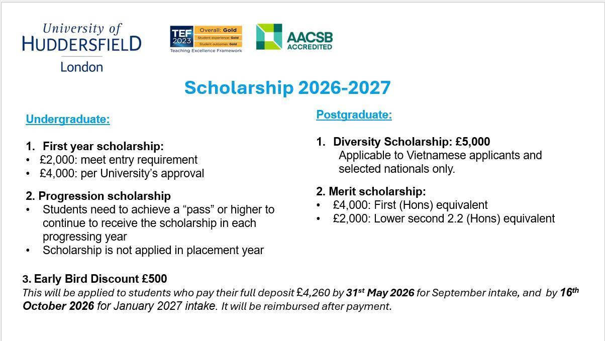 CHƯƠNG TRÌNH HỌC BỔNG NIÊN KHÓA 2026-2027 TỪ TRƯỜNG UNIVERSITY OF HUDDERSFIELD, LONDON – ANH QUỐC