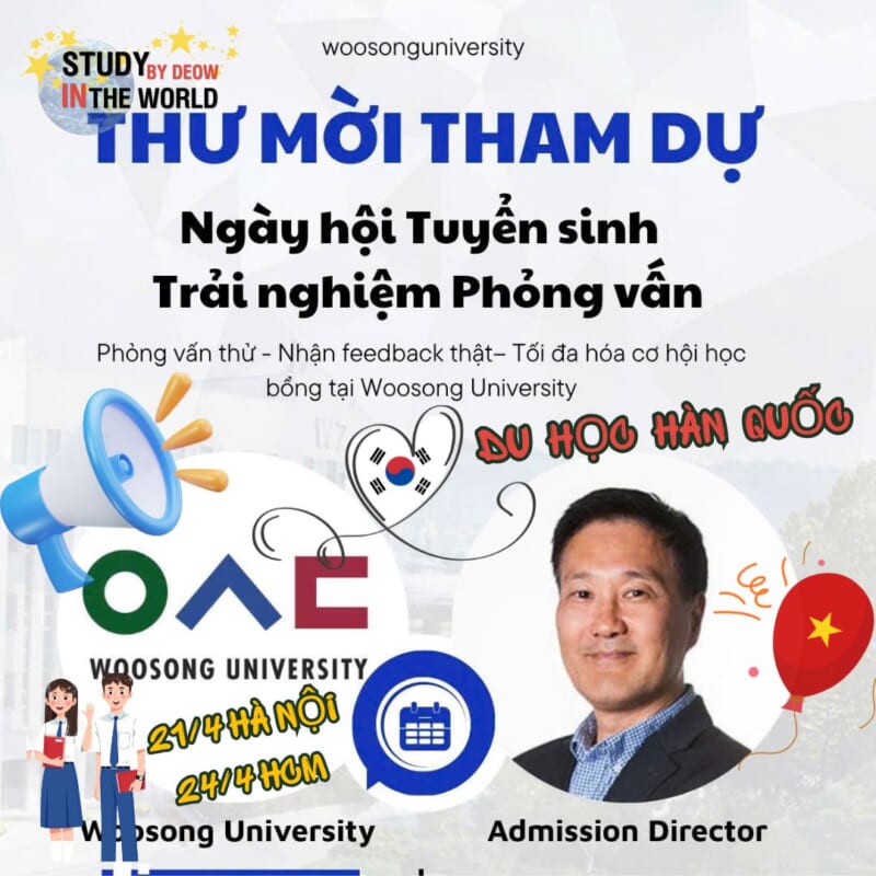 Tháng 4 này, DEOW phối hợp cùng Đại học Woosong (Woosong University) mang đến cơ hội vàng để các bạn học sinh Việt Nam gặp gỡ trực tiếp “huyền thoại” trong làng tuyển sinh quốc tế và nhận ngay học bổng chỉ sau một buổi phỏng vấn.