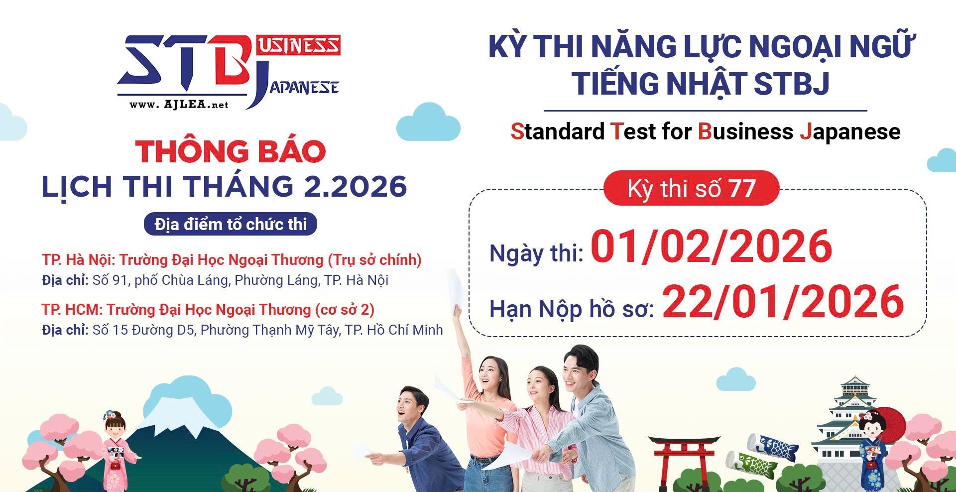 STBJ tại Việt Nam – Hội đồng thi cấp chứng chỉ năng lực ngoại ngữ tiếng Nhật STBJ xin trân trọng thông báo tới các đơn vị, tổ chức và các bạn thí sinh về thời hạn nộp hồ sơ, thời gian và địa điểm đăng ký và tổ chức kỳ thi chứng chỉ STBJ lần thứ 77 năm 2026 tại Việt Nam, như sau: