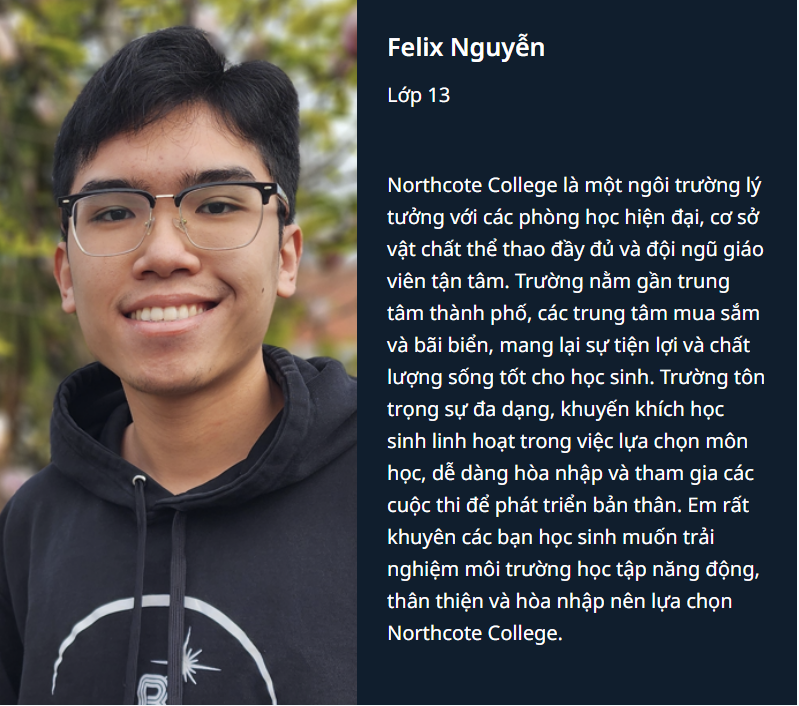 🌟 Ở Northcote College, học sinh không chỉ tìm thấy chương trình học tập chất lượng cao, mà còn cả một cộng đồng học thuật năng động và đa dạng, nơi mỗi học sinh được khuyến khích để khám phá và nuôi dưỡng đam mê của mình.